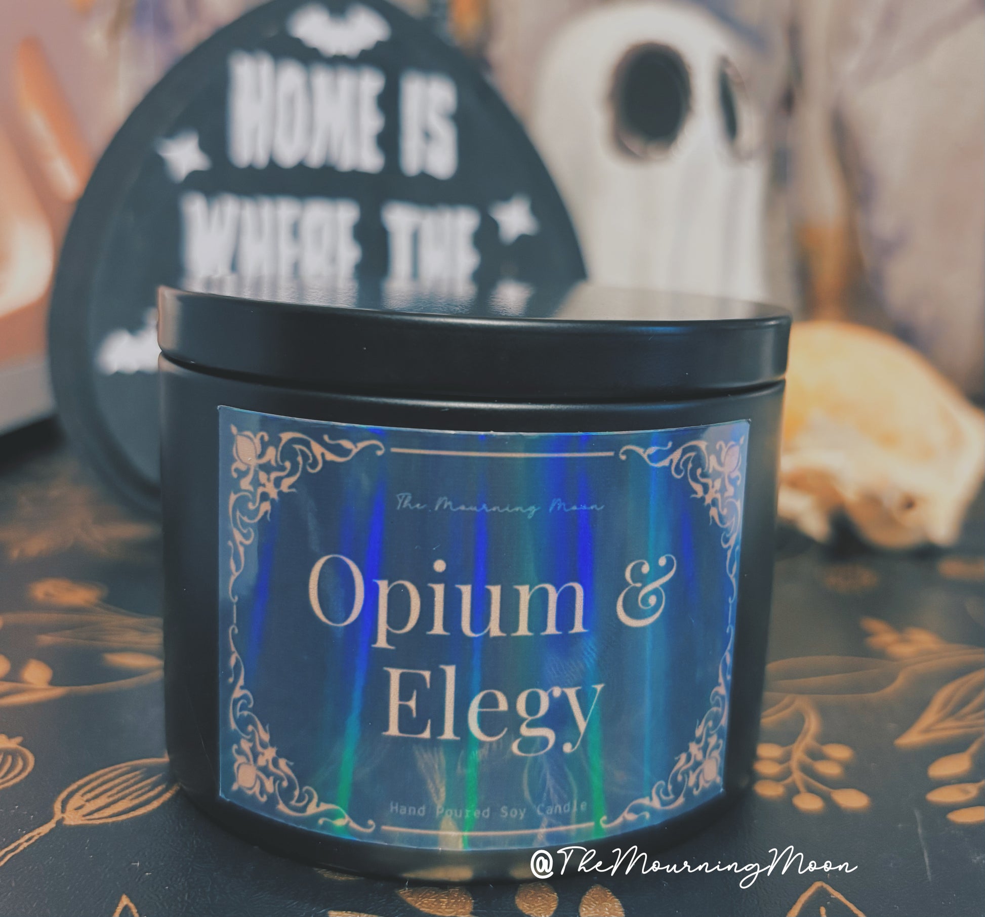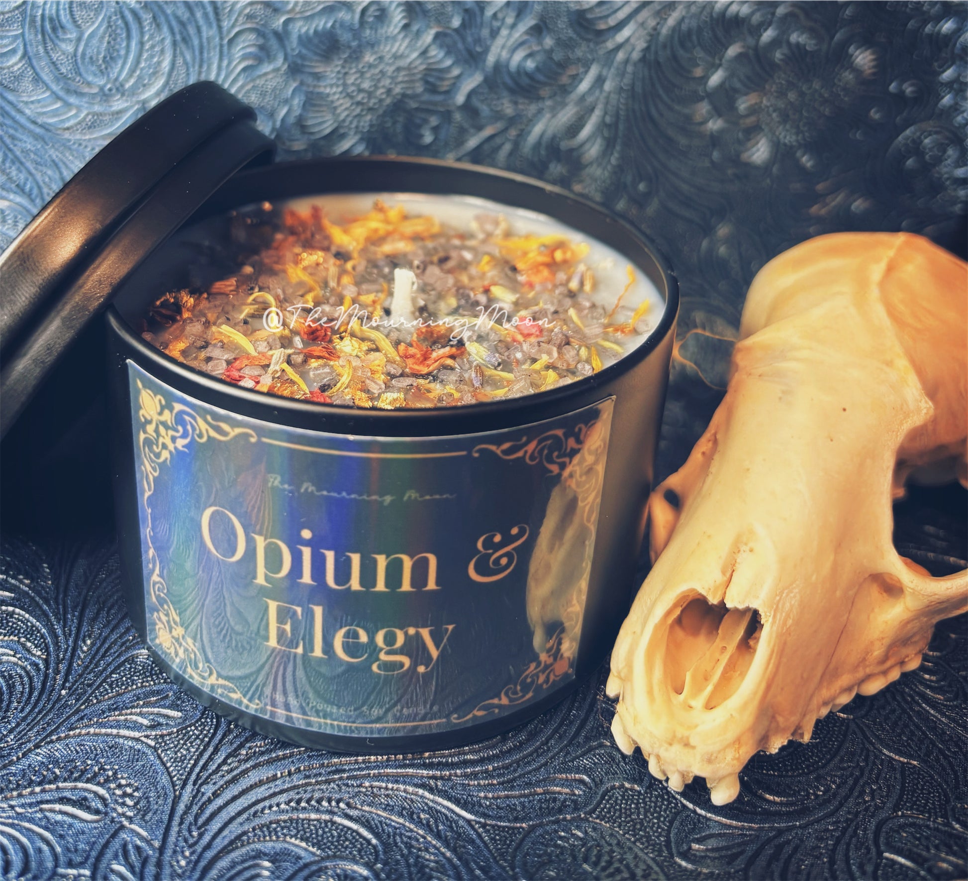Opium & Elegy is a dark, resinous blend of spiced myrrh, warm sandalwood, and soft amber kissed with floral musk and the scent of earth after rain. This hauntingly beautiful fragrance evokes a sense of longing, memory, and what’s left behind.