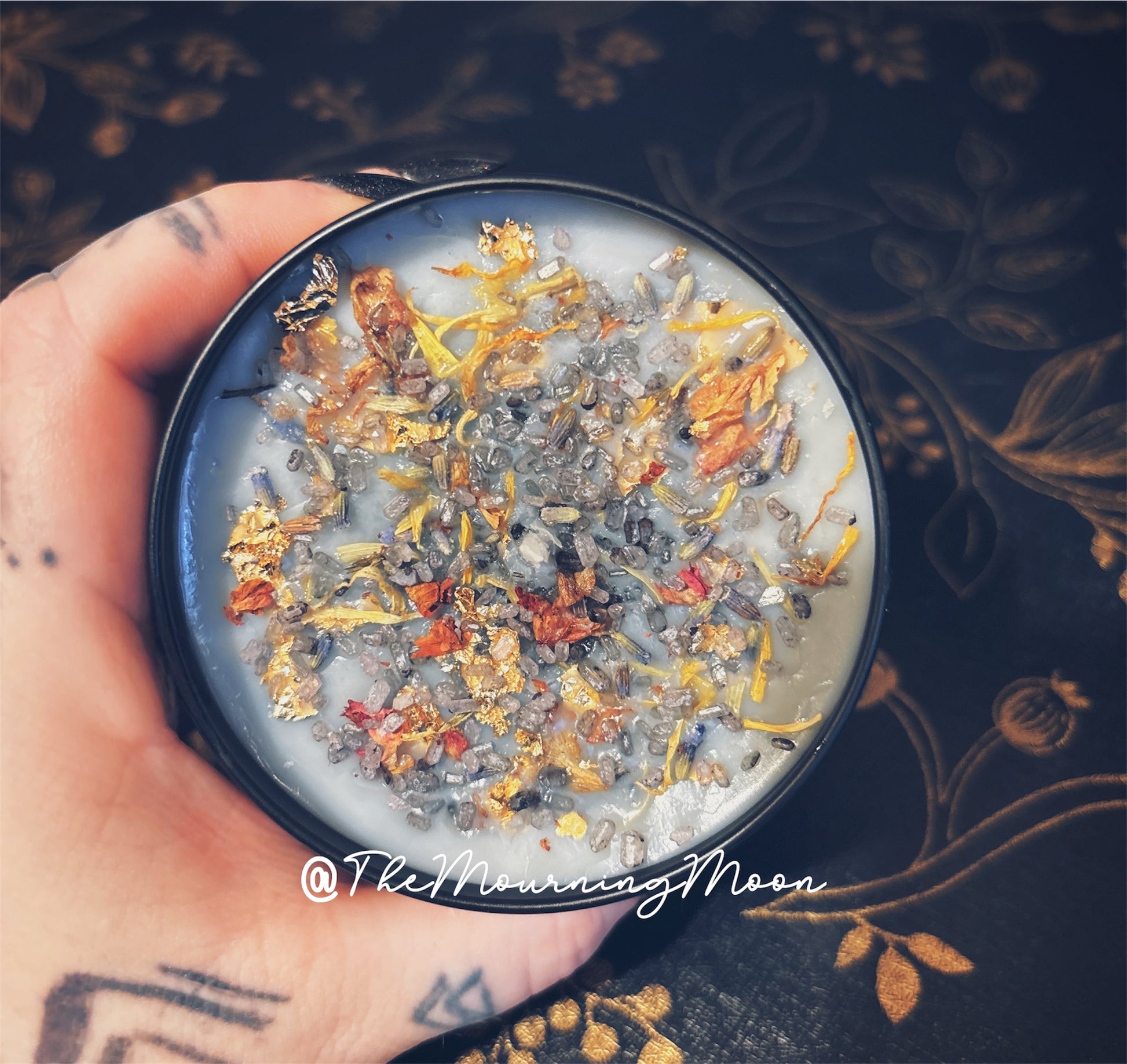 Hand-poured in small batches using 100% soy wax and adorned with dried botanicals and shimmering gold leaf, this 8oz candle is more than a scent, it’s a ceremony. Whether burned during moments of quiet reflection, spellwork, or simple indulgence, it invites you into a space of deep feeling and intentional grief.